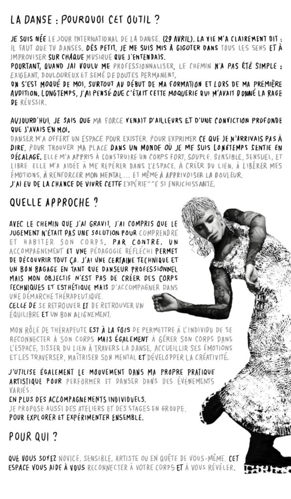 J’ai redécouvert ma connexion avec mon corps, amélioré mon expression personnelle et plongé dans un état créatif profond qui m’a emmenée là où je n’aurais jamais imaginé aller. Tout cela dans un espace de confiance et d’échange. Il est attentionné, inspirant, encourageant, patient, professionnel, sympathique et talentueux.